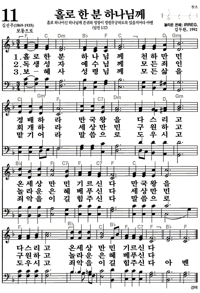 11장- 홀로 한 분 하나님께 찬송가의 고화질 악보입니다.