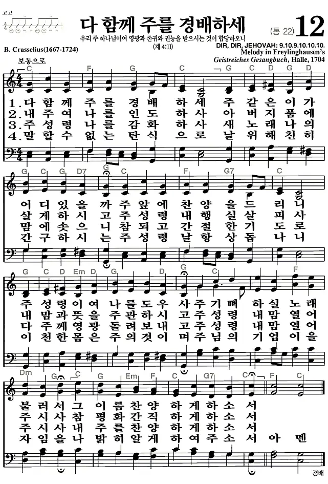 새찬송가_악보] 12장 - 다 함께 주를 경배하세 다운로드(고화질/인쇄용)