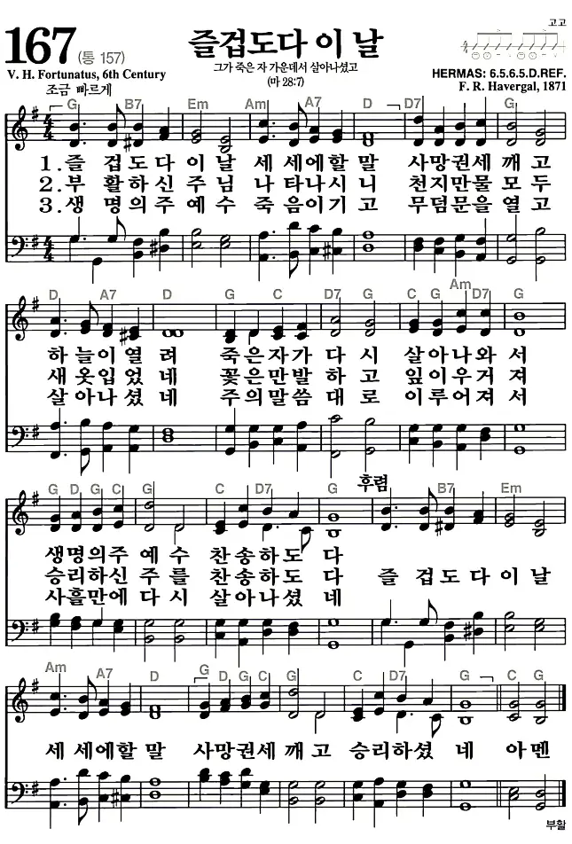 167장 - 즐겁도다 이 날 찬송가의 고화질 악보입니다.