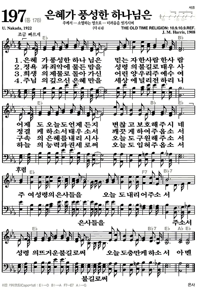 197장 - 은혜가 풍성한 하나님은 찬송가의 고화질 악보입니다.
