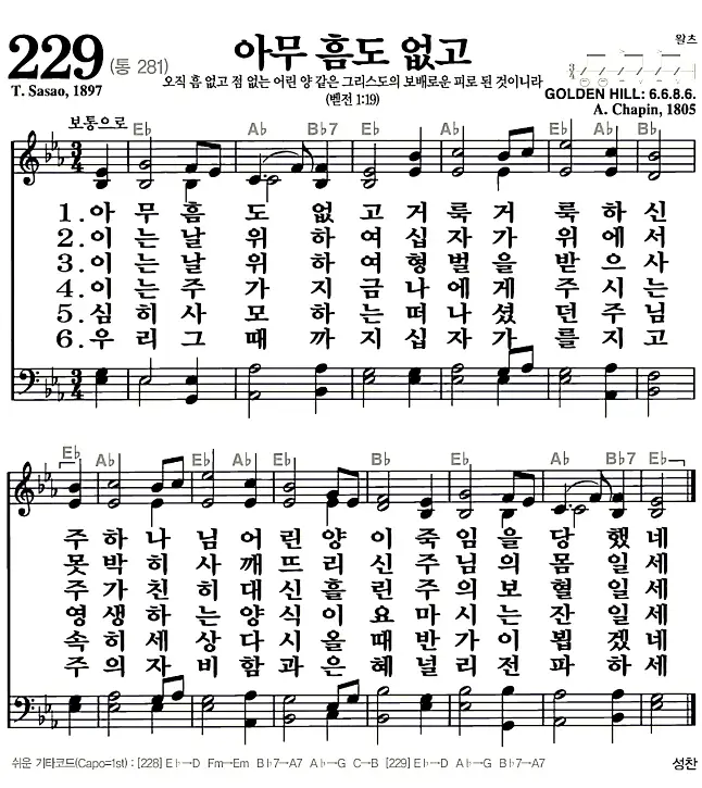 새찬송가_악보] 229장 - 아무 흠도 없고 다운로드(고화질/인쇄용)