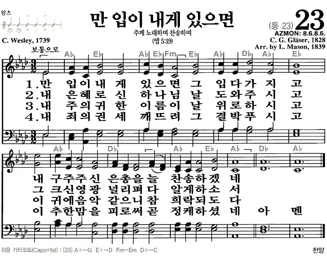 23장 - 만 입이 내게 있으면 찬송가의 고화질 악보입니다.