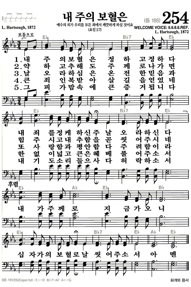 254장 - 내 주의 보혈은 찬송가의 고화질 악보입니다.