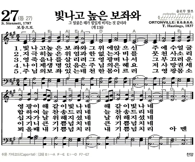 27장 - 빛나고 높은 보좌와 찬송가의 고화질 악보입니다.