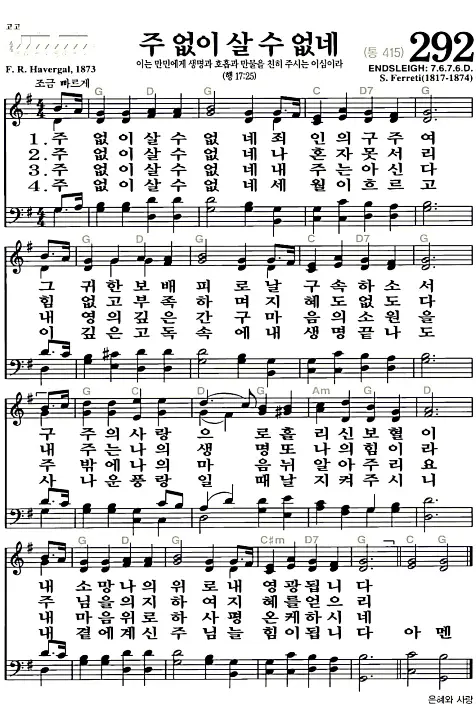 새찬송가_악보] 292장 - 주 없이 살 수 없네 다운로드(고화질/인쇄용)