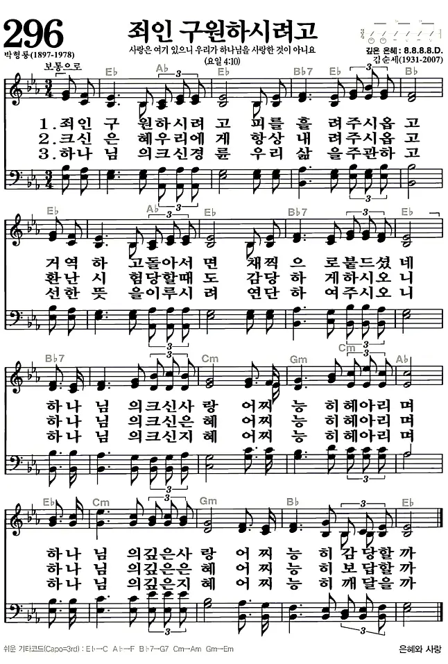 새찬송가_악보] 296장 - 죄인 구하시려고 다운로드(고화질/인쇄용)