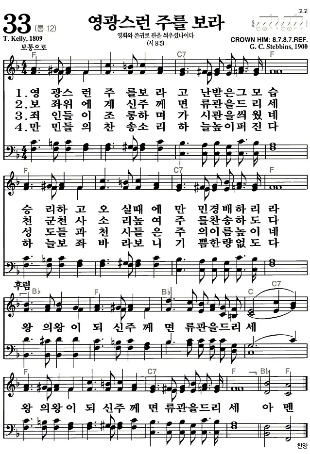 33장 - 영광스런 주를 보라 찬송가의 고화질 악보입니다.