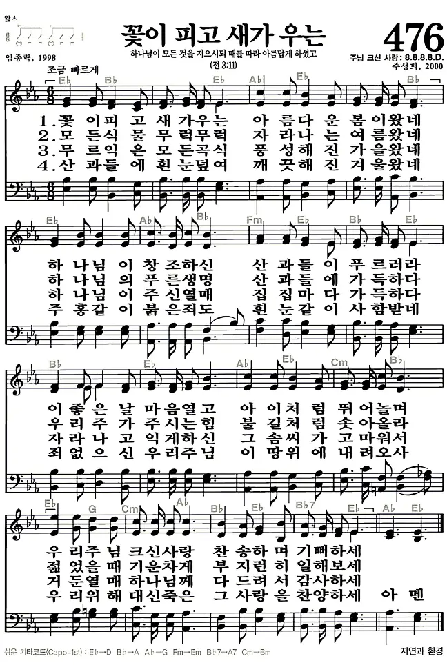 새찬송가_악보] 476장 - 꽃이피고 새가 우는 다운로드(고화질/인쇄용)