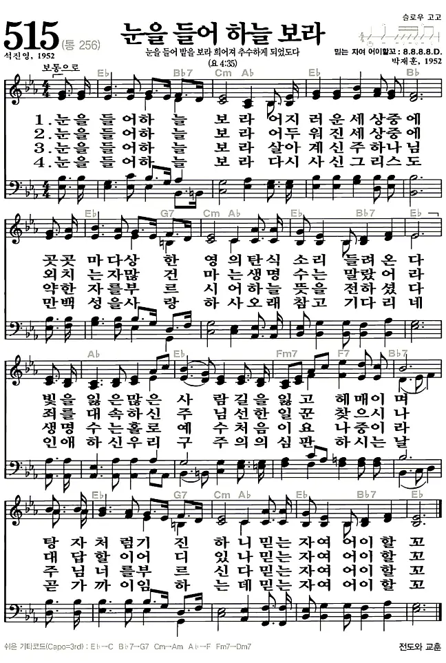 515장 - 눈을 들어 하늘보라 찬송가의 고화질 악보입니다.