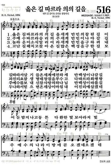 새찬송가_악보] 516장 - 옳은 길 따르라 의의길을 다운로드(고화질/인쇄용)