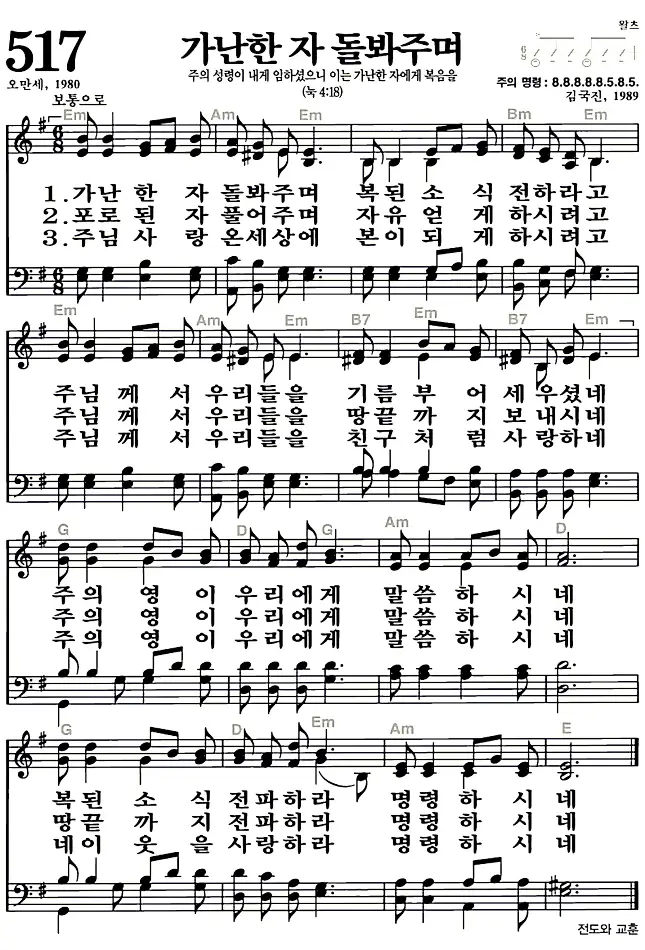 517장 - 가난한 자 돌봐주며 찬송가의 고화질 악보입니다.