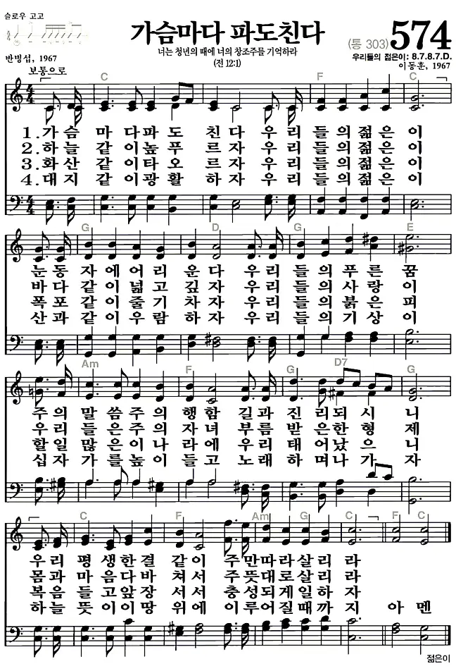 574장 - 가슴마다 파도친다 찬송가의 고화질 악보입니다.