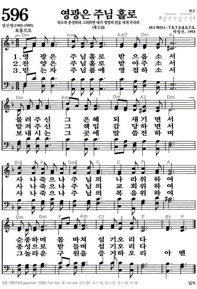 596장 - 영광은 주님 홀로 찬송가의 고화질 악보입니다.