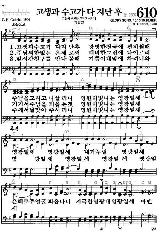 610장 - 고생과 수고가 다 지난후 찬송가의 고화질 악보입니다.