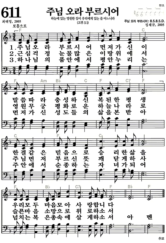 새찬송가_악보] 611장 - 주님오라 부르시어 다운로드(고화질/인쇄용)