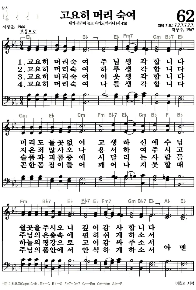 62장 - 고요히 머리 숙여 찬송가의 고화질 악보입니다.