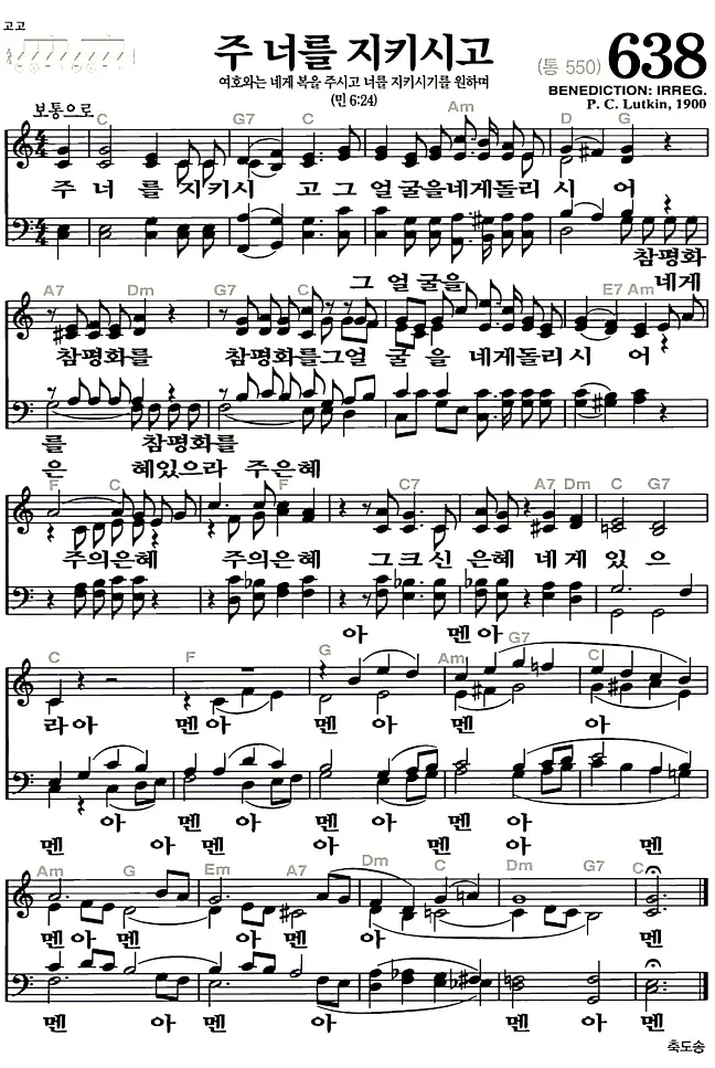 638장 - 주 너를 지키시고 찬송가의 고화질 악보입니다.