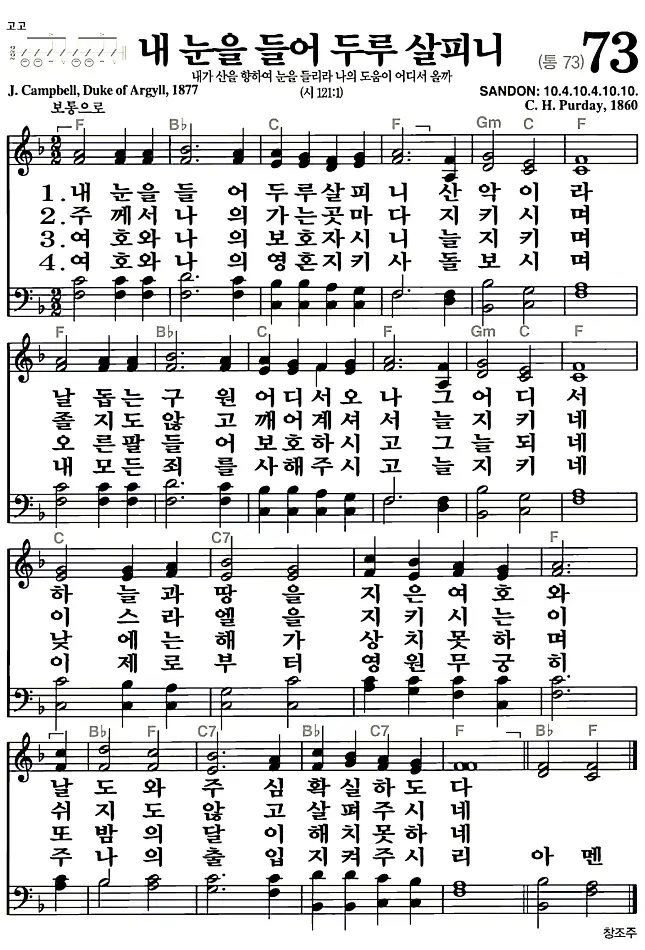 73장 - 내 눈을 들어 두루 살피니 찬송가의 고화질 악보입니다.
