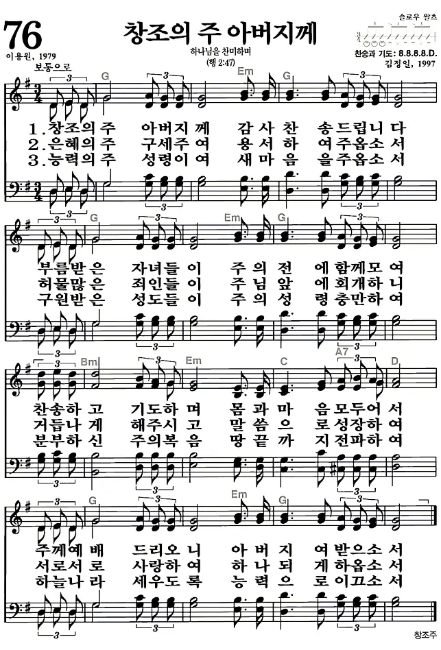 76장 - 창조의 주 아버지께 찬송가의 고화질 악보입니다.