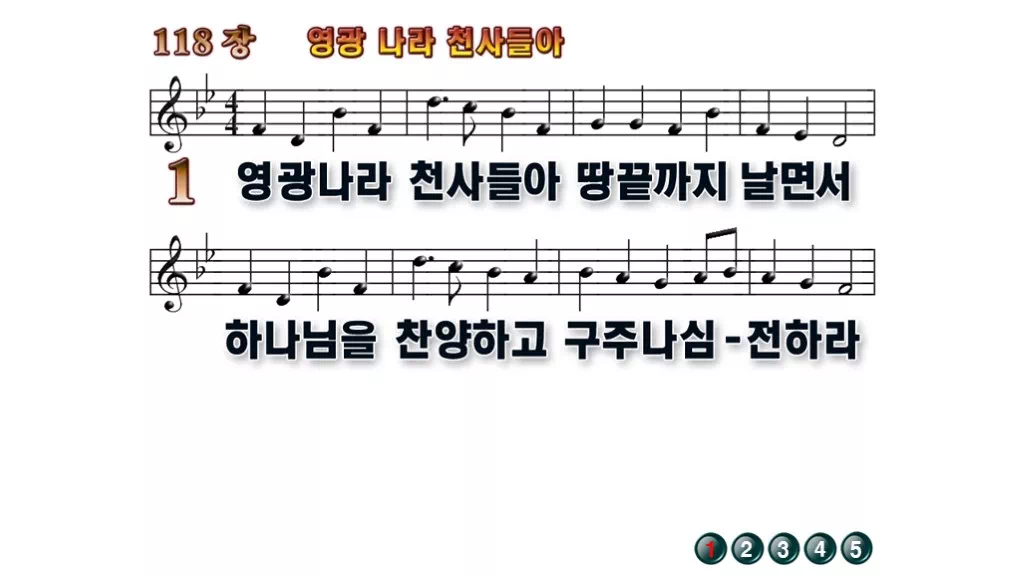 118장 - 영광 나라 천사들아 찬송가의 배경없는 PPT 악보입니다.