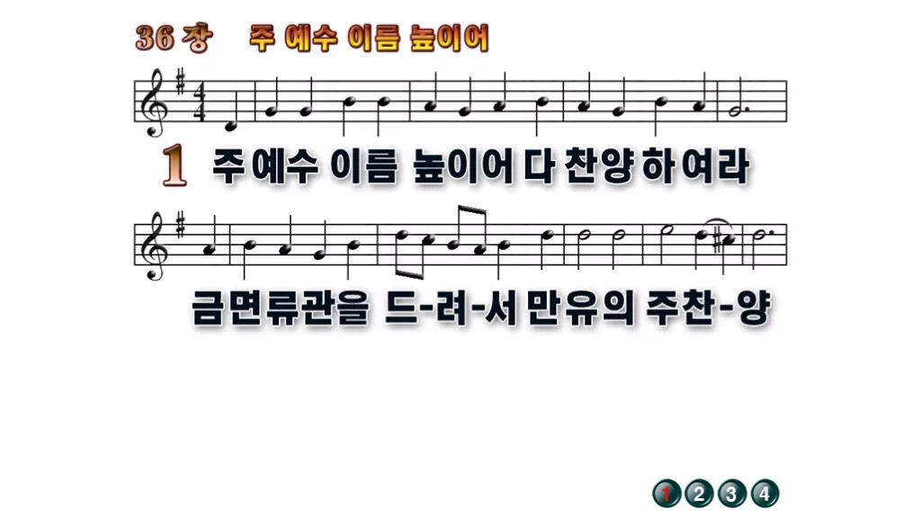 36장 - 주 예수 이름 높이어 찬송가의 배경없는 PPT 악보입니다.