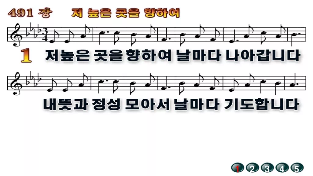 491장 - 저 높은 곳을 향하여 찬송가의 배경없는 PPT 악보입니다.