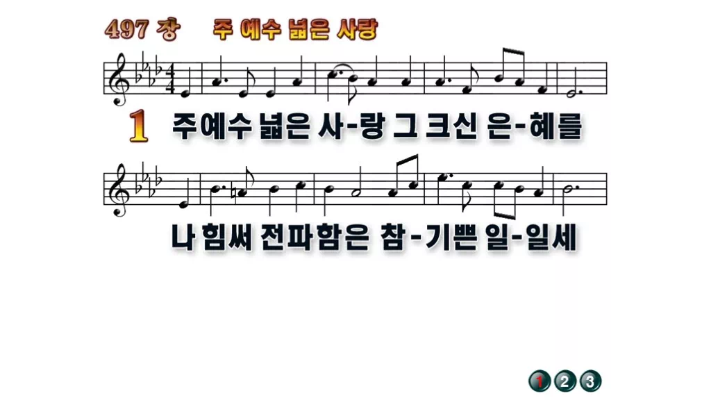 497장 - 주 예수 넓은 사랑 찬송가의 배경없는 PPT 악보입니다.