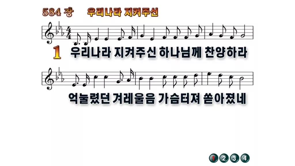 584장 - 우리나라 지켜주신 찬송가의 배경없는 PPT 악보입니다.