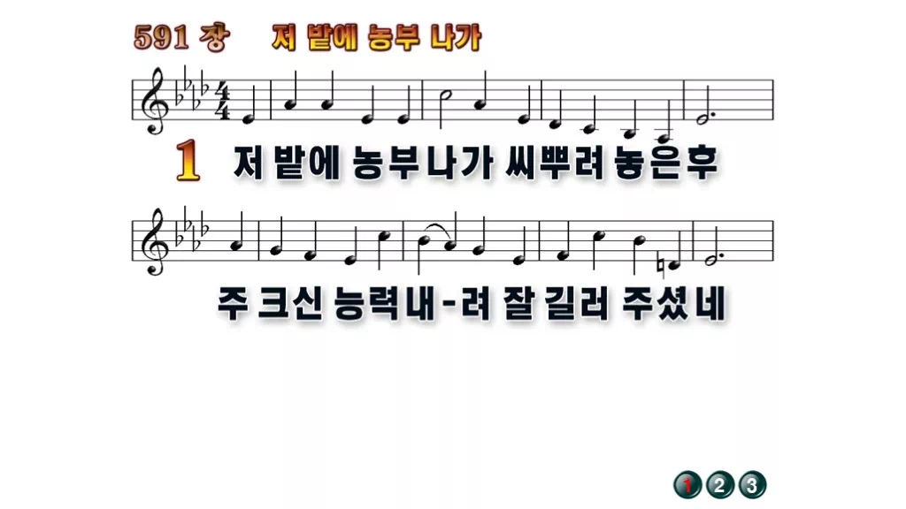 591장 - 저 밭에 농부나가 찬송가의 배경없는 PPT 악보입니다.