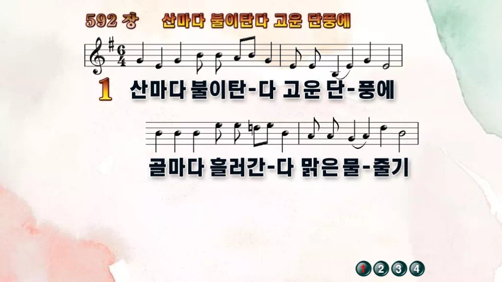 592장 - 산마다 불이 탄다 고운단풍에 찬송가의 PPT 악보입니다.