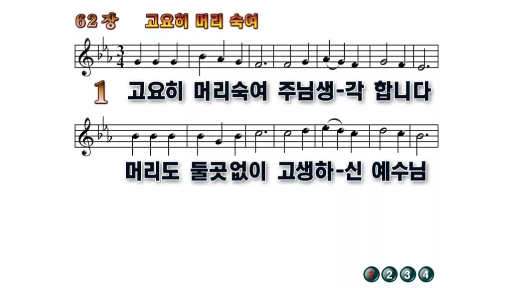 62장 - 고요히 머리 숙여 찬송가의 배경없는 PPT 악보입니다.