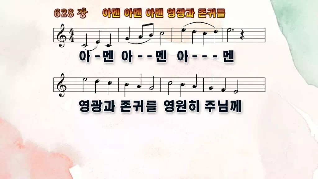 628장 - 아멘아멘아멘 영광과 존귀를 찬송가의 PPT 악보입니다.